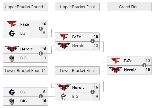Wydawało się, że FaZe Clan będzie w stanie przełamać scenariusz i osiągnąć zwycięstwo w grupie C przez górny przedział. W tym samym czasie zespół zaczął od dwóch pewnych zwycięstw nad Evil Geniuses (16:8) i Heroic (16:10). Jednak w finale kwartetu FaZe Clan przegrał z Heroic (10:16), pozwalając tym samym Duńczykom na kontynuowanie trendu do niższej drabinki.