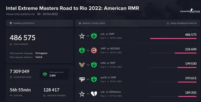 Walka między zespołami Complexity a Imperial Esports na IEM Road to Rio 2022 American RMR zyskała największą popularność wśród widzów spośród wszystkich turniejów RMR. W szczytowym momencie grę o prawo do uczestnictwa w majorze obejrzało 486 575 widzów (z wyłączeniem widzów chińskich serwisów streamingowych). Serwis analityczny Esports Charts podzielił się podobnymi danymi.